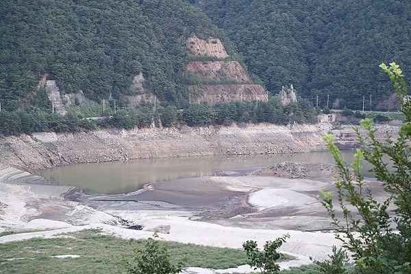 △当地时间9月6日,韩国江陵,因持续干旱,五峰山水库水位持续下降。该水库为江陵地区供应87%的家庭用水。